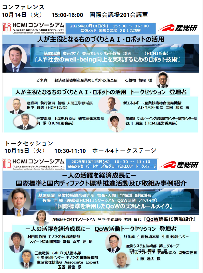 CEATEC2025に出展します。 【CEATEC2025】 開催 2025年10月14日(火)~17日(金) 10:00-17:00 場所 幕張メッセ 来場には来場事前登録が必要になります。CEATECのWEBからご登録ください。 https://www.ceatec.com/ja/ HCMLコンソーシアムはホール4 4H110 に出展しています。 ぜひお立ち寄りください。 ブースでは8つのパネルを展示します。 ◆ものづくりを支える熟練者短期育成に向けた 知識・判断メカニズムのモデル化 ◆産業技術総合研究所 ウェルビーイング実装研究センター 活動紹介 ◆人の活躍を経済成長に 多様な人材が活躍 QoW(Quality of Working)マルチタレントマネジメント ◆RX推進人材育成講座 - 企業における生産戦略のためのDX+R(ロボット)ー ◆溶接を対象とした VR技能トレーニング技術の開発 ◆時空間情報 遠隔協調サイバーフィジカルにおける時空間同期基盤 ◆三菱電機-産総研 Human-Centricシステムデザイン連携研究室 人とロボットの遠隔融合によるWell-being ◆三菱電機-産総研 Human-Centricシステムデザイン連携研究室 パーソナルウェルビーイング統合ソリューションの開発 コンファレンス、トークステージにも登壇します。 コンファレンスの聴講をするためには本年の来場事前登録を完了する必要があります。